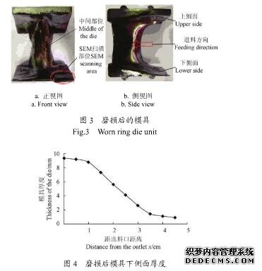 模具中間部位的磨損直接影響到壓輪和環模間的間隙,實際生產中主要通過調整間隙使磨損后的模具繼續工作,在間隙不能調整時模具失效,因此該處的磨損量非常關鍵,該型模具中間部位的極限磨損量為12mm。