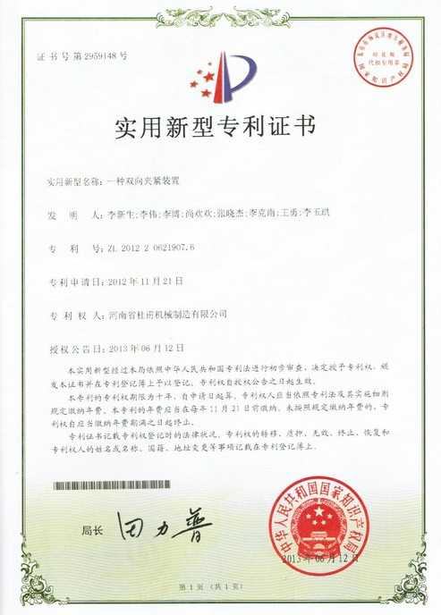 實(shí)用新型專利證書--銘澤機(jī)械
